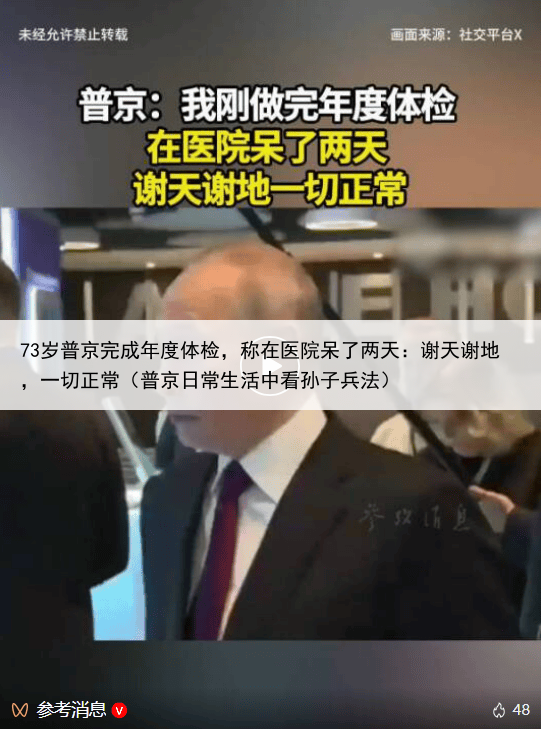73岁普京完成年度体检,称在医院呆了两天:谢天谢地,一切正常(普京日常生活中看孙子兵法)