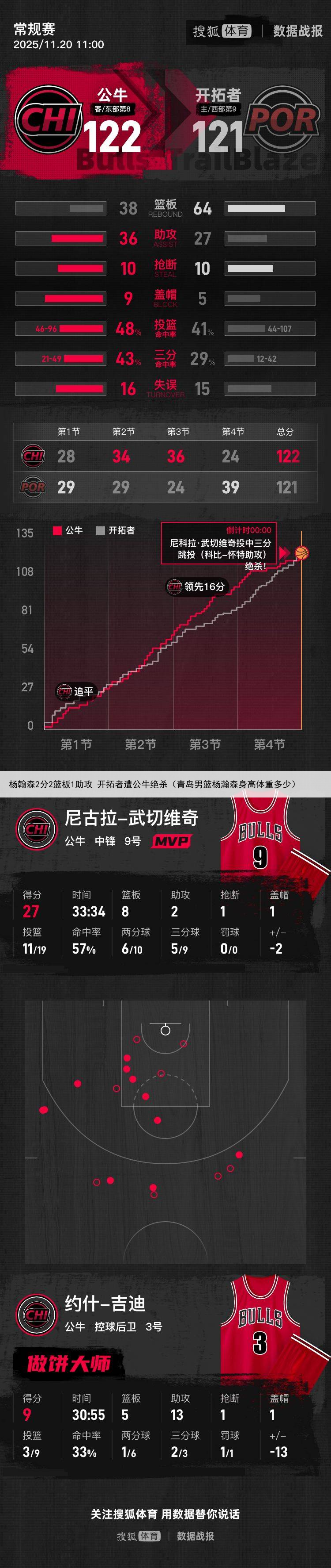【搜狐体育战报】北京时间11月20日,2025-26赛季NBA常规赛继续进行,波特兰开拓者主场迎战芝加哥公牛全场打完,公牛拒绝逆转122-121险胜开拓者,杨瀚森本场得到2分2篮板1助攻全场数据:具体比分:28-29、34-29、36-24、24-39(开拓者在后)。