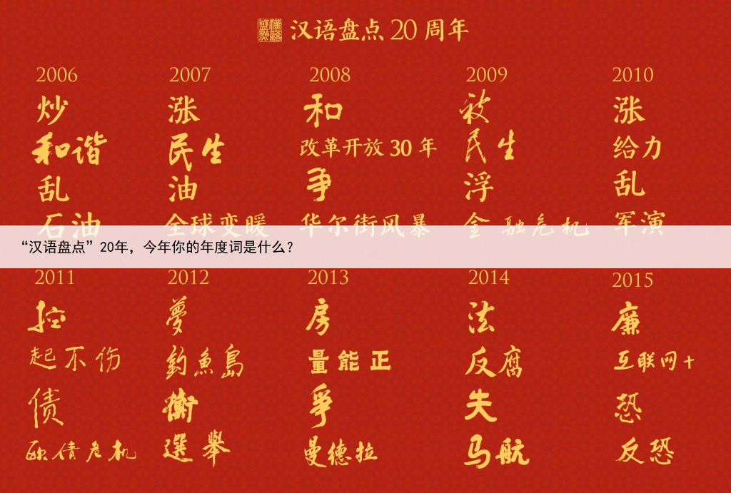 今年是“汉语盘点”活动举办的第二十年,这个盘点举办的目的在于“用一个字、一个词描述当年的中国与世界”,鼓励全民用语言记录生活,描述中国视野下的社会变迁与世界万象启动仪式上,主办方发布了“专家版”与“大数据版”的年度推荐字词。