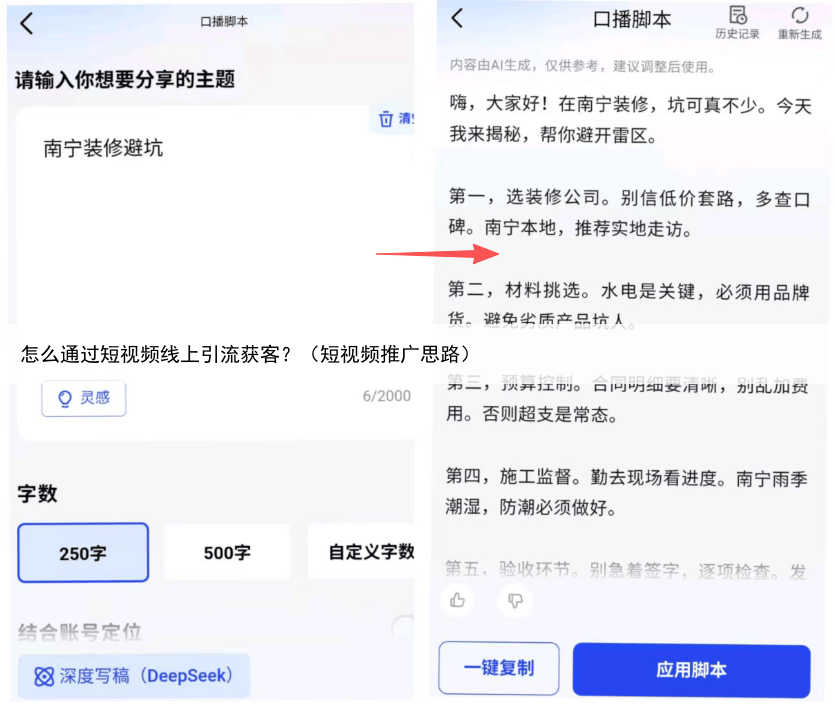 精准内容生产:用 AI 打通创作堵点引流的核心是优质内容,开拍的 AI 脚本功能直击文案痛点接入 DeepSeek R1 模型的脚本生成系统,输入 “南宁装修避坑” 等关键词,即可一键产出 3-5 版 “区域 + 需求” 型爆款文案。