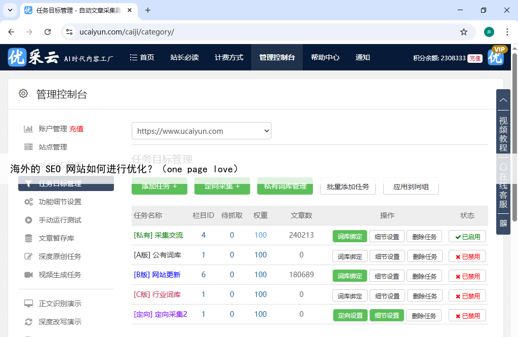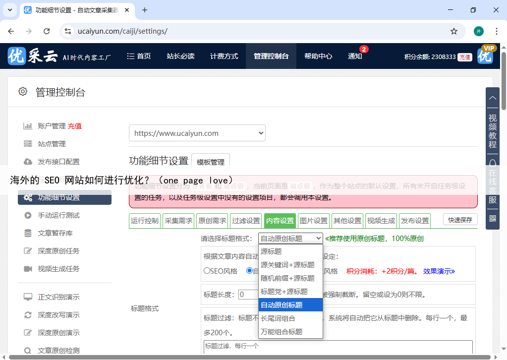 原创内容生成方面,优采云提供多种算法版本,用户可设定文章长度、引用联网搜索或知识库内容,并可选热点植入、原创度提升、自动小标题生成等功能以优化内容质量在内容优化环节,系统提供标题格式定制(如AI原创标题、长尾词组合)、关键词插入、内容替换、伪原创改写及多语言翻译等功能。