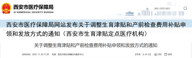 11月20日 西安市医疗保障局网站发布 关于调整生育津贴和产前检查费用补贴申领和发放方式的通知 具体内容如下