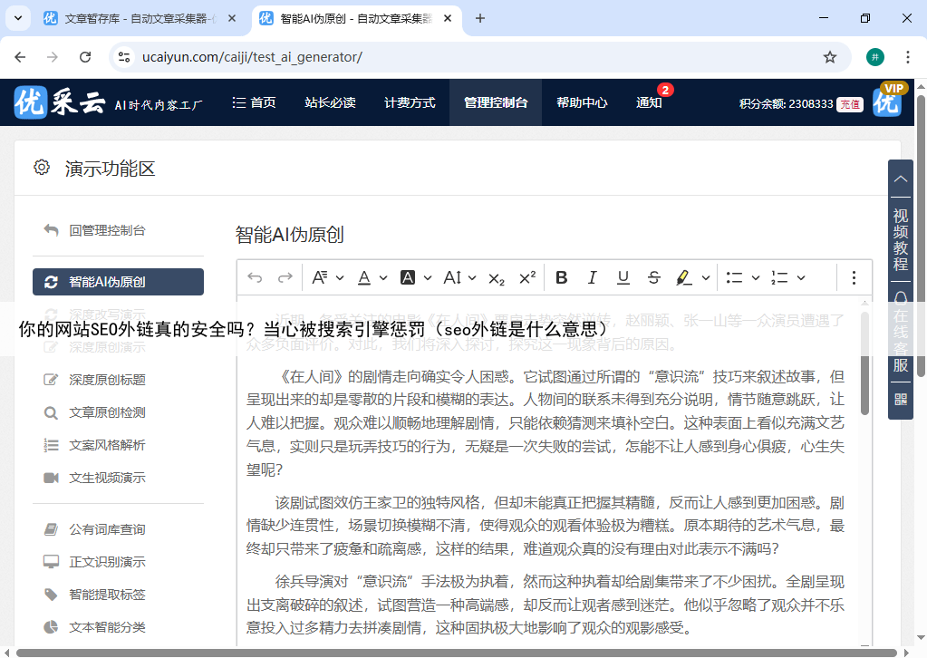 在原创生成方面,优采云使用AI算法生成高可读性文章,并允许用户设置期望长度、热点植入和原创度提升选项,这有助于创建独特且相关的内容,避免重复问题链接建设方面,工具提供自动内链、关键词插入和固定链接功能,能自然地在内容中添加相关链接,提升SEO效果。