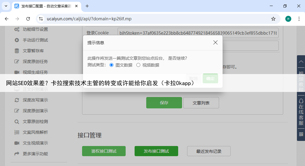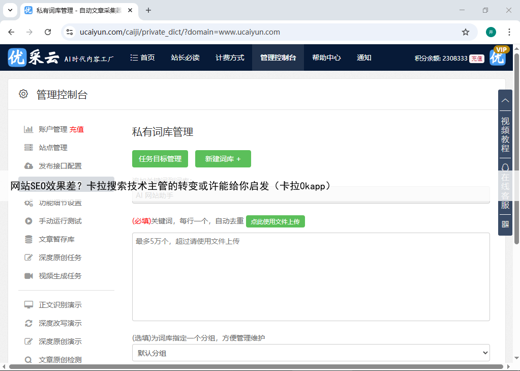 优采云不仅能根据关键词生成全新的技术文章,还能通过热点植入功能,自动结合最新的行业动态,这让生成的内容更具时效性和吸引力张明远还开启了自动生成小标题功能,使文章结构更加清晰易读卡拉搜索 SEO效果提升的关键在哪里。