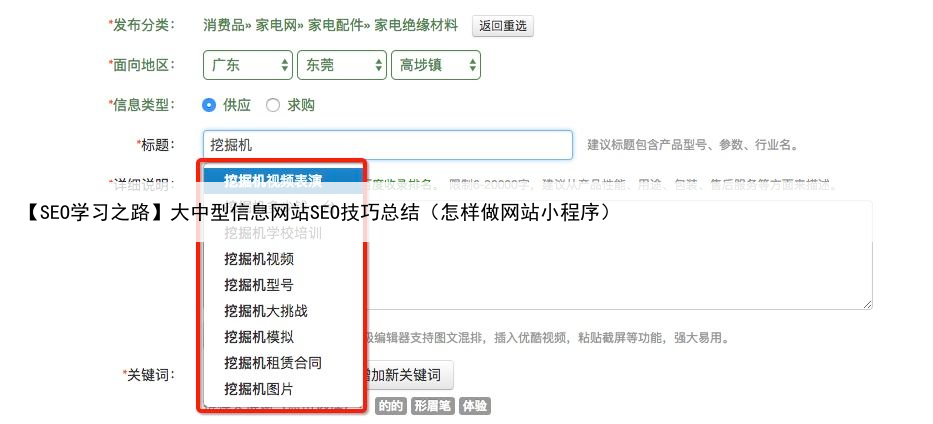 用户发布信息填写标题时,会出现下拉词,这里使用百度下拉JS代码,这样既不耗费自己服务器资源还可以让用户输入有一定SEO价值的关键词。
