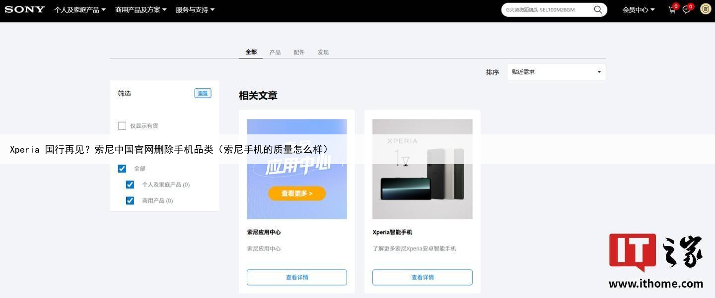 IT之家注意到,目前索尼中国官网已删除手机品类的产品,在“个人及家庭产品”和“商用产品及方案”中,均无法找到手机产品虽然通过官网的搜索功能,依然能看到 Xperia 智能手机的相关文章并支持跳转至手机品类页面,但点击具体的手机产品则会“无限月读”Xperia 索尼智能手机品类的页面,。