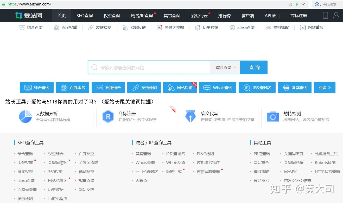 大家好,我是黄大司,今天我们讲一下,SEO综合查询工具很多SEO新人都会遇到这样一个问题,我要了解一个网站,不管是自己还是竞争对手,SEO做得如何,怎么看呢,这就需要用到SEO综合查询工具,目前SEO综合工具用的比较多的就是站长工具、爱站以及5118这三个。