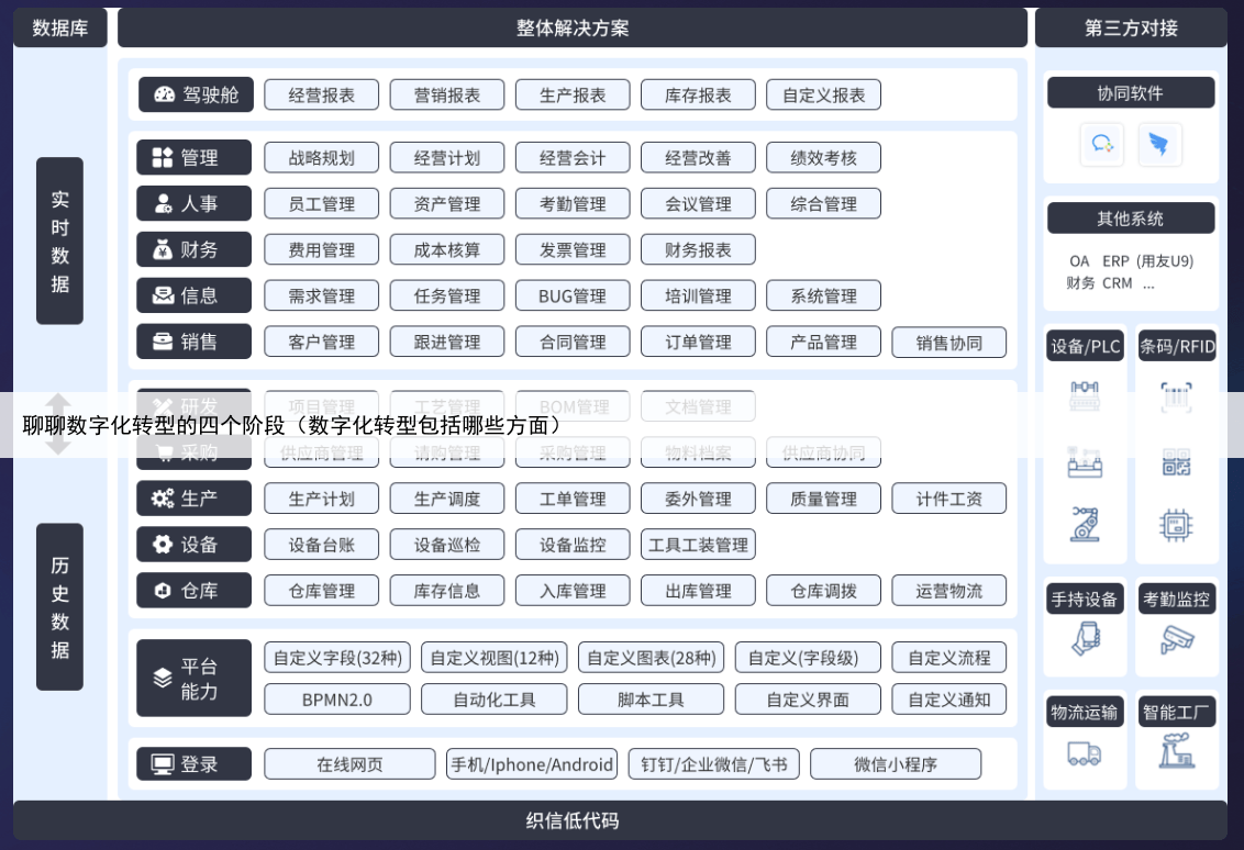 数字化转型是一条持续进化的道路,大致可以划分为四个阶段:信息化阶段:这是数字化转型的起点企业从单点突破,利用OA、ERP、CRM等系统,将传统纸质流转变为电子化处理这一阶段的特点是提高工作效率、降低错误率,但本质上仍是"电子化搬迁",没有真正改变业务模式。
