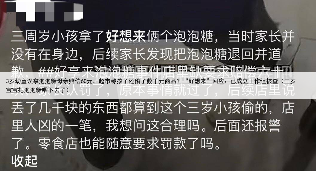3岁幼童误拿泡泡糖母亲赔偿60元,超市称孩子还偷了数千元商品?“好想来”回应:已成立工作组核查(三岁宝宝把泡泡糖咽下去了)