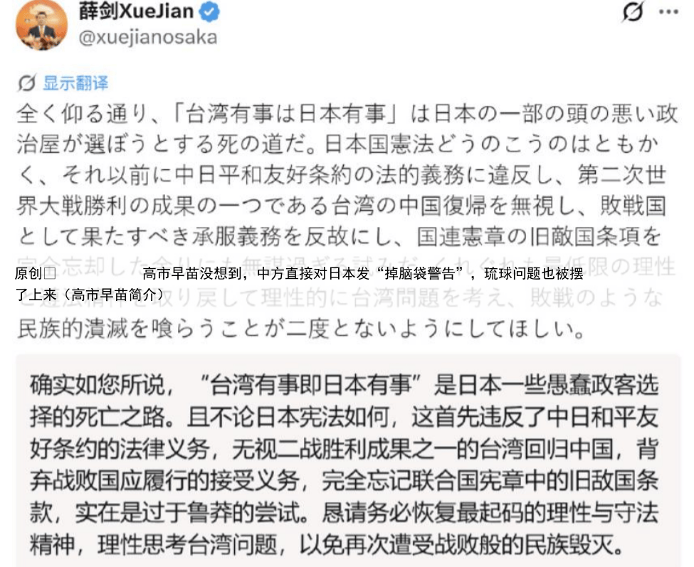 原创 高市早苗没想到,中方直接对日本发“掉脑袋警告”,琉球问题也被摆了上来(高市早苗简介)