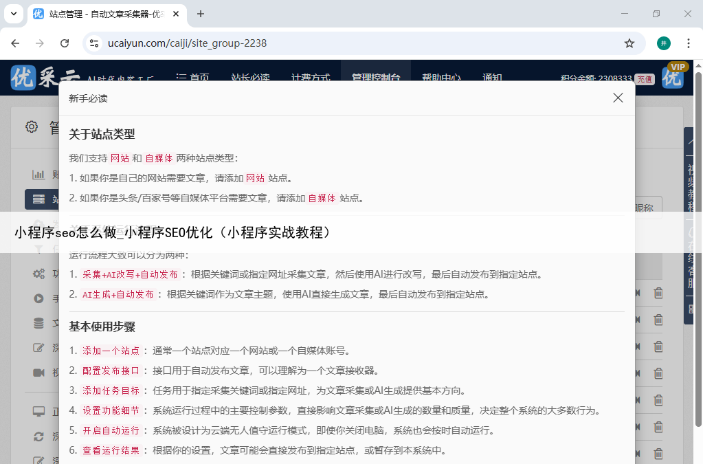 他决定从关键词优化开始通过优采云所具备的关键词插入功能,能够将“年轻人时尚穿搭建议”“潮流装备推荐”等目标关键词精准无误地插入到相应页面当中优采云还能自动根据文章内容生成SEO风格的标题,为他的小程序提高曝光。