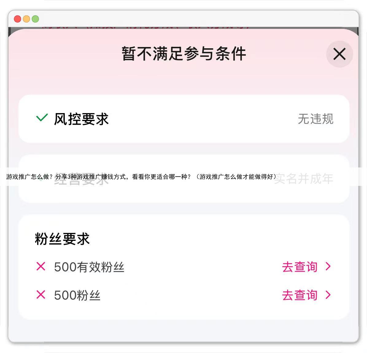 一:小视频游戏推广小视频游戏推广主要集中在抖音。要求是抖音有效粉丝大于等于500,账号无违规,并且实名并成年,才可以操作。