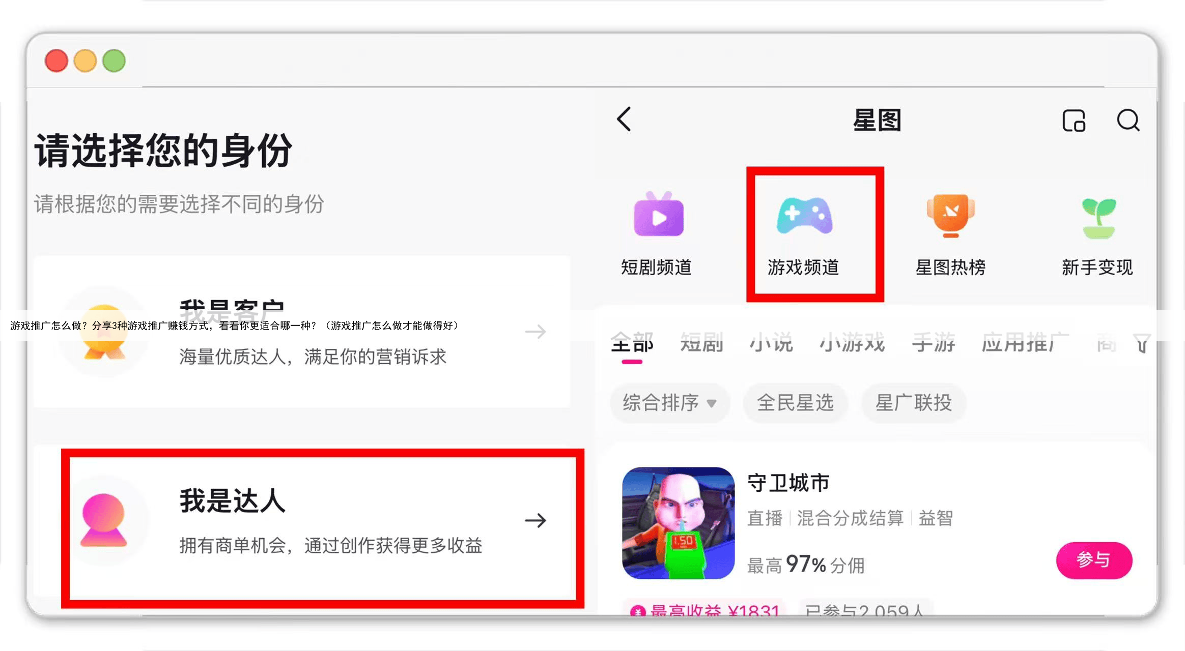 他的推广形式特别简单,就是领取任务后,创作视频内容,参与投稿即可。那小视频游戏推广具体怎么做呢?首先:打开抖音,搜索巨量星图,选择“我是达人”,进入游戏频道;