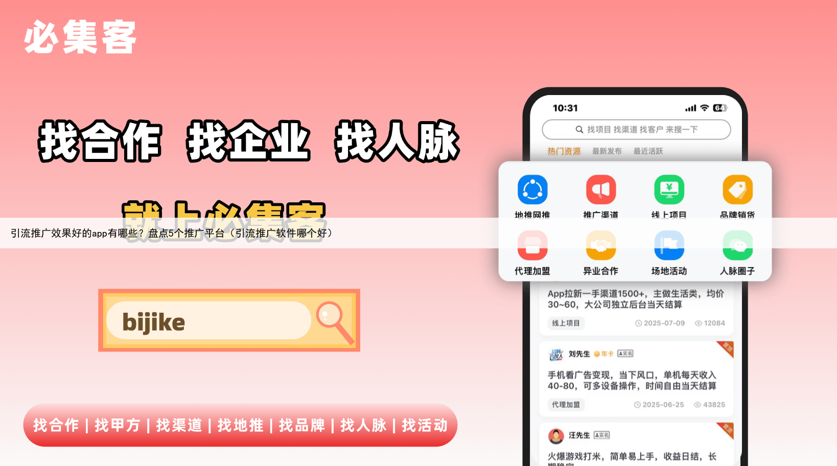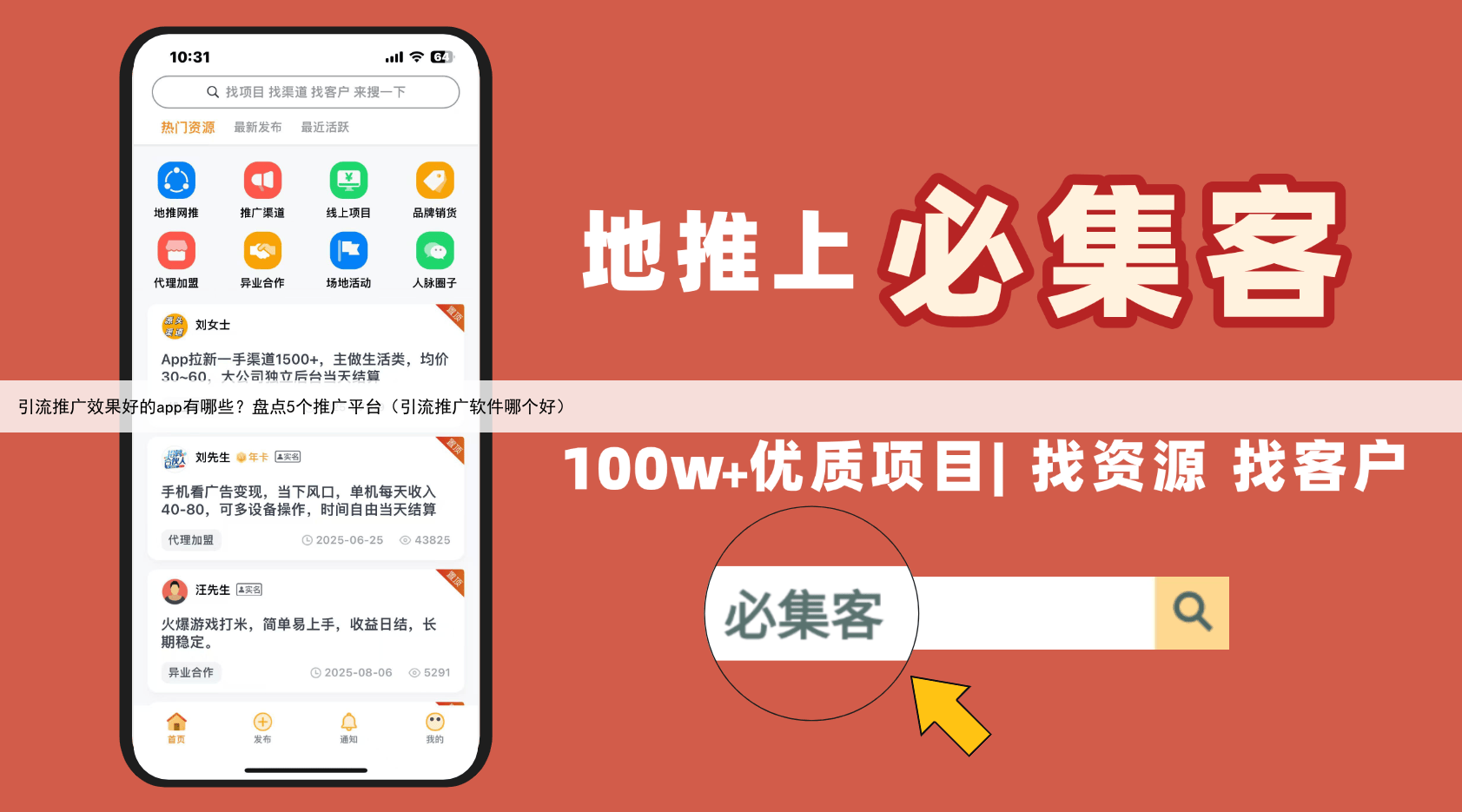 因此,集客圈成为了众多企业和个人进行引流推广的首选平台之一2必集客必集客app作为一款商务资源对接平台,不仅具备地推app接任务平台的功能,还汇聚了大量的优质项目和用户资源通过必集客,用户可以快速找到适合自己的推广项目,并与项目方进行直接沟通,达成合作。