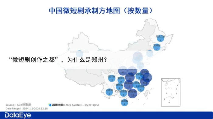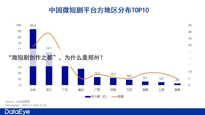 郑州虽然微短剧拍摄量全国第二,但平台方多数还是集中在北京、浙江和广东 图片来源:DalaEye 郑州虽然以惊人的开机量不断抢占市场份额,但也被视作成本洼地和代工基地,对于怎样面对激烈的区域竞争和产业升级,未来如何证明自己不仅能拍,更能“创”。