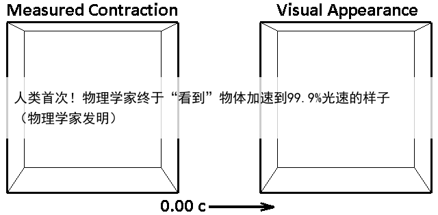 立方体以不同速度运动时(c为光速),尺缩效应(左)和它看起来的样子(右)当观测者看到立方体后侧的光线时,他看到的来自立方体前方的光线,实际上是立方体运动到更前方时发出的这会导致立方体看起来就像旋转了一样。