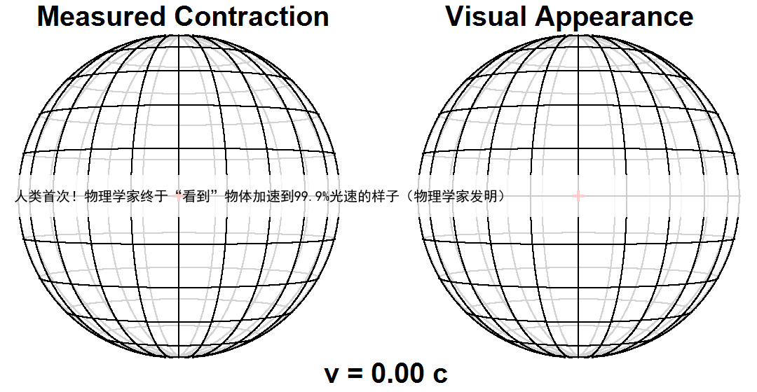 按照洛伦兹因子收缩的物体模型例如,一个边长为1米的立方体,在0.8倍光速的速度下,其长度应收缩为原长的0.6倍,因此他们制作了一个 1m × 1m × 0.6m 的长方体对于速度为0.999c的球体,模型则被压缩成一个几乎平坦的圆盘。