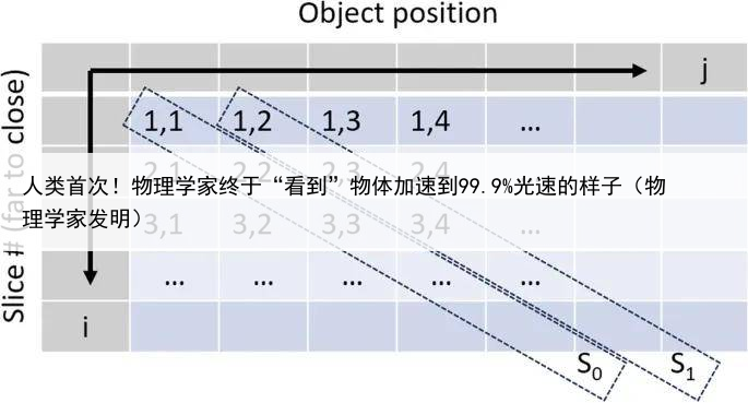 将物体在不同位置(横轴j)拍摄的不同切片照片(纵轴i,数字按从远到近排列)按错位方式组合成同一帧(S₀、S₁……),再将这些帧组合成连续的视频,研究人员就能模拟出物体以近光速运动的视频图片来源:原论文研究团队按照这种方式制作出了多张照片,并将照片组合成视频。